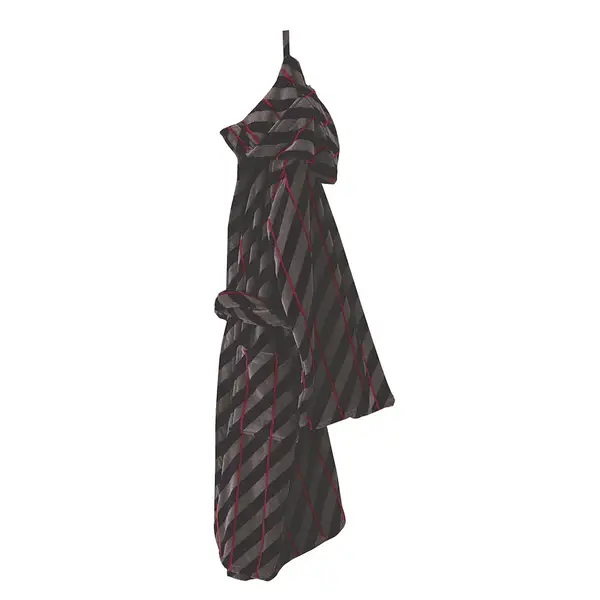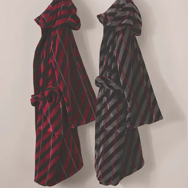 Righe spesse trasversali ispirate alla cravatta del duca di Kent con Luton, il nuovo accappatoio della collezione B-side di Pretti. Modello jacquard tinto filo di puro cotone idrofilo, fondo cimato, filato doppio ritorto. Modello con ampio cappuccio, cintura cucita su centro schiena e due pratiche tasche laterali, sagomate piazzate a doppia ribattitura.