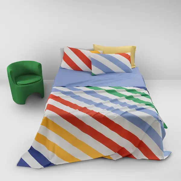 Righe diagonali larghe e audaci con Diago,il nuovo completo lenzuolo-copriletto stampato con tecnica digitale su tela di puro cotone da 58 fili al cmq.