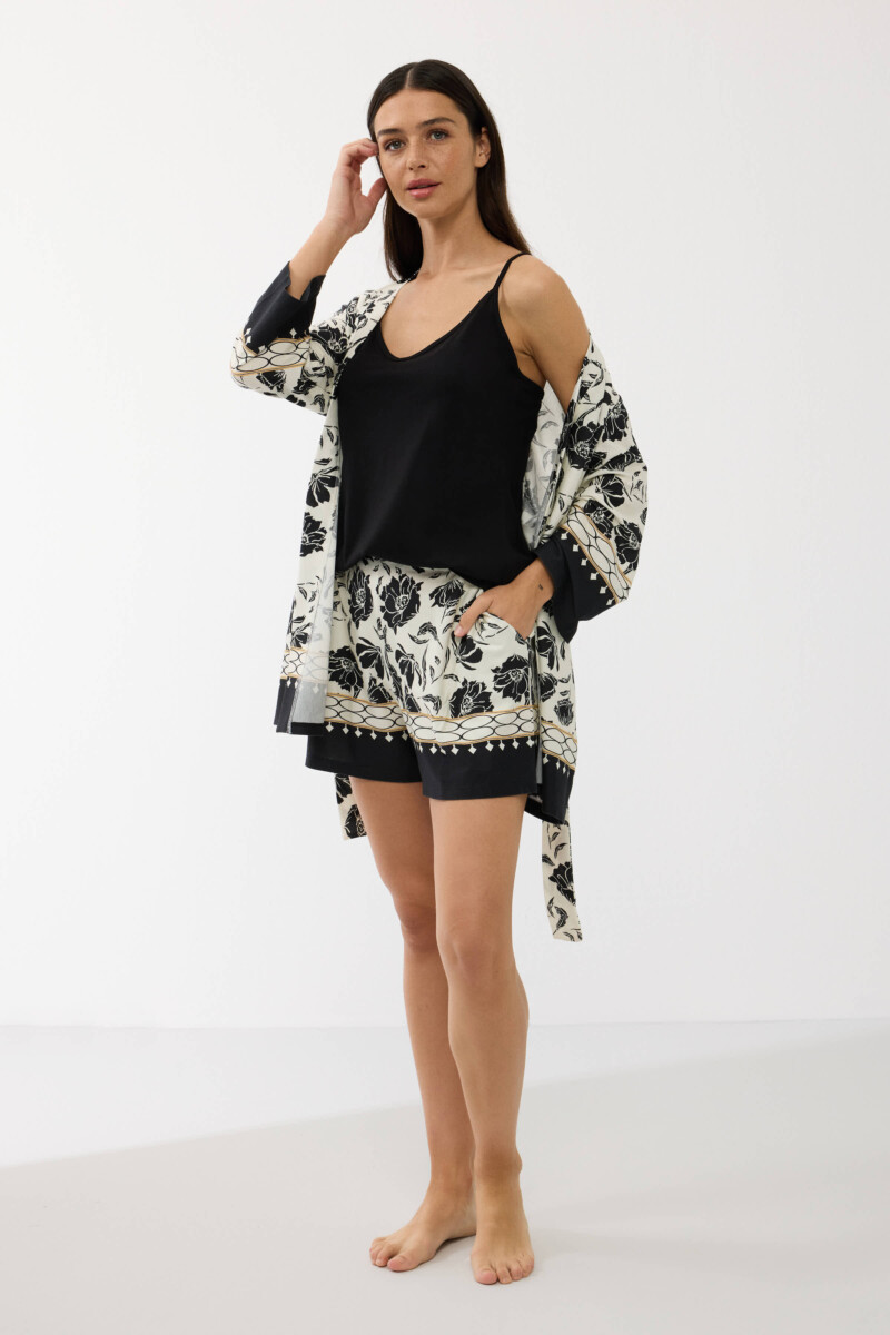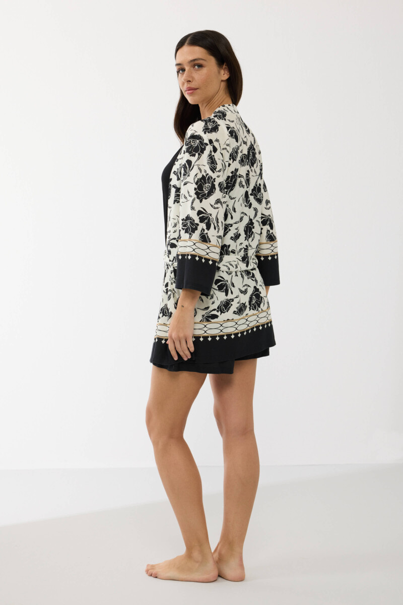 Kimono: leggero e fluido, con maniche a 3/4 e cintura in vita. È caratterizzato da una fantasia floreale nera su fondo chiaro, arricchita da bordi decorativi geometrici in contrasto su maniche e orlo.