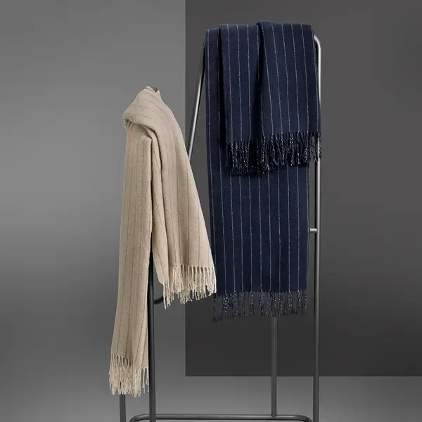 Raffinato plaid gessato in misto lana, con frange morbide e delicate per offrire un tocco di ricercatezza.